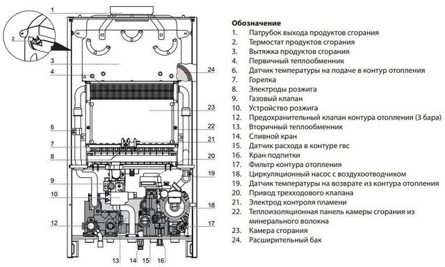 Настенный газовый котел Ariston CLAS EVO 24 CF - экономичный газовый котел среднего уровня, с открытой камерой сгорания, оборудован двумя теплообменниками, двухскоростным насосом, имеет погодозависимую автоматику. Газовые котлы Ariston CLAS EVO 24 CF являются оптимальным оборудованием для понимающих в экономии. Настенный котёл мощностью 24 кВт для отопления и горячего водоснабжения, с 2-мя надежными раздельными теплообменниками, уникальной гидравлической группой, новейшей логикой управления и большим цифровым дисплеем. Новое оборудование отличает доступная цена, что делает его крайне привлекательным продуктом на отопительном рынке. Схема конструкции: